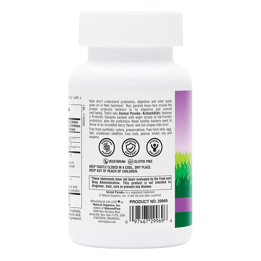 It’s digestion support in disguise…with fun animal shapes, kids won’t know Animal Parade AcidophiKidz is good for them. Animal Parade ® AcidophiKidz ® delivers intestinal flora which benefits gastrointestinal balance. Pure fructooligosaccharides (FOS) help maximize the effects of probiotics by enhancing bioavailability & fostering friendly intestinal flora growth.
