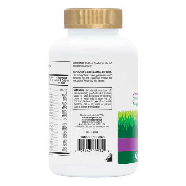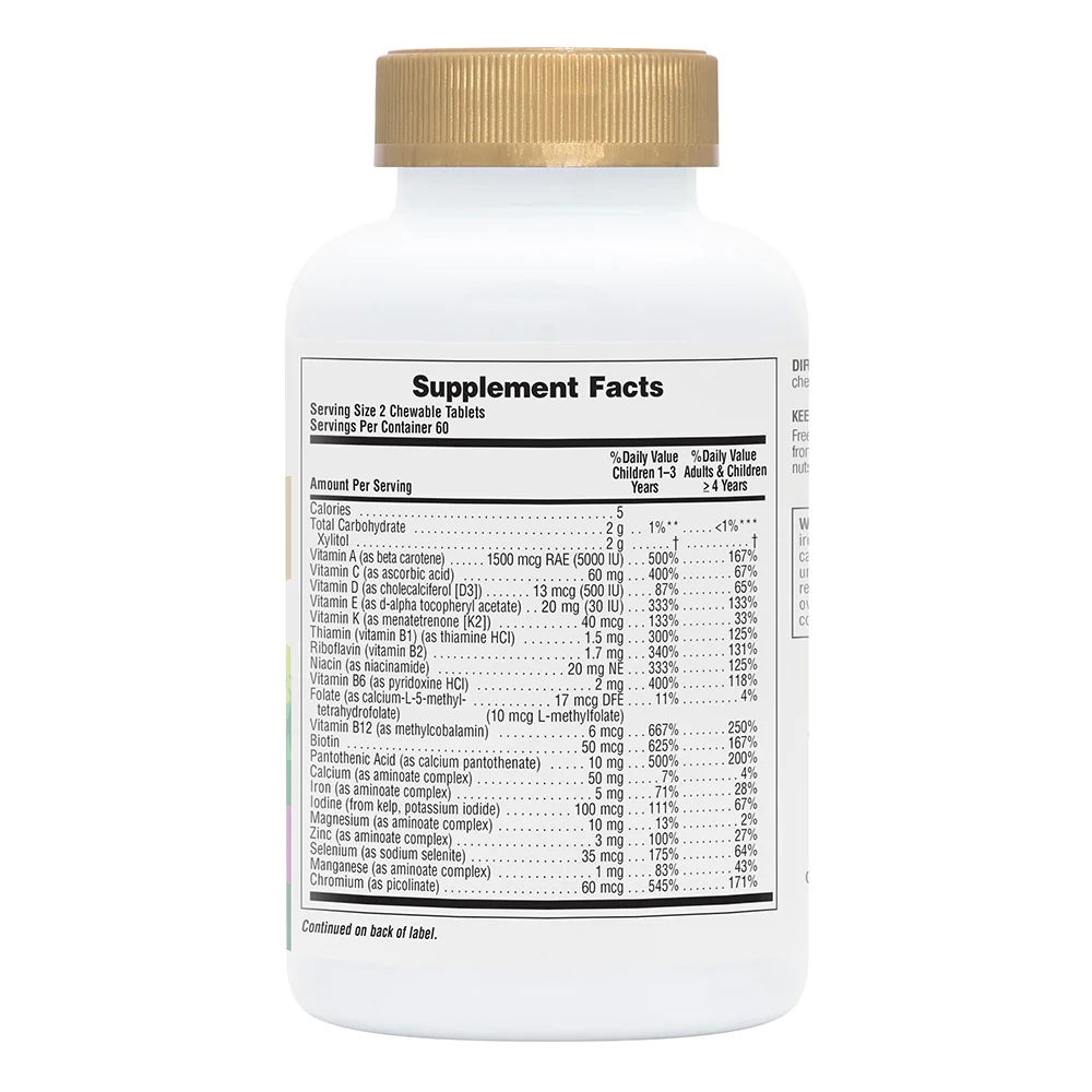 Other ingredients: Xylitol, natural colour (beet juice), citric acid, guar gum, stearic acid, natural grape flavour, magnesium stearate. Certified Organic Gold Standard Whole Food Blend (acerola extract, apple, broccoli sprout, cauliflower sprout, collard, cordyceps mushroom mycelia, kale, kale sprout, maitake mushroom mycelia, nettle, parsley, beet juice, carrot juice, spirulina, reishi mushroom mycelia, shiitake mushroom mycelia, spinach, tomato juice, bilberry, blueberry, chlorella), apple pectin, calcium carbonate, ferrous fumarate, magnesium oxide, zinc oxide, potassium iodide, choline bitartrate, inositol, rose hips, whole brown rice, broccoli, spinach, mango fruit, carrot, West Indian cherry (Malpighia glabra fruit), papaya fruit. mineral aminoates are whole brown rice chelates.
