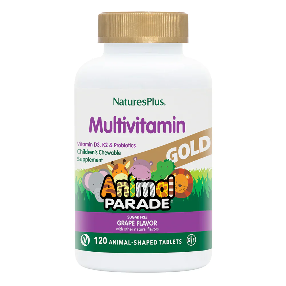 With Vitamin D3, Vitamin K2, Probiotics and Organic Gold Standard Whole Foods Animal Parade® GOLD Multi Childrens Chewable takes this best-selling multi-vitamin and mineral formula to the next level! The award-winning taste continues in a delicious sugar-free formula, bursting with grape flavour! Each serving of these fun, animal-shaped chewables is now packed with 500 IU of vitamin D3, more trace minerals, enzymes, probiotics, and over 20 organic whole foods like broccoli & spinach (psst…don’t tell them!)